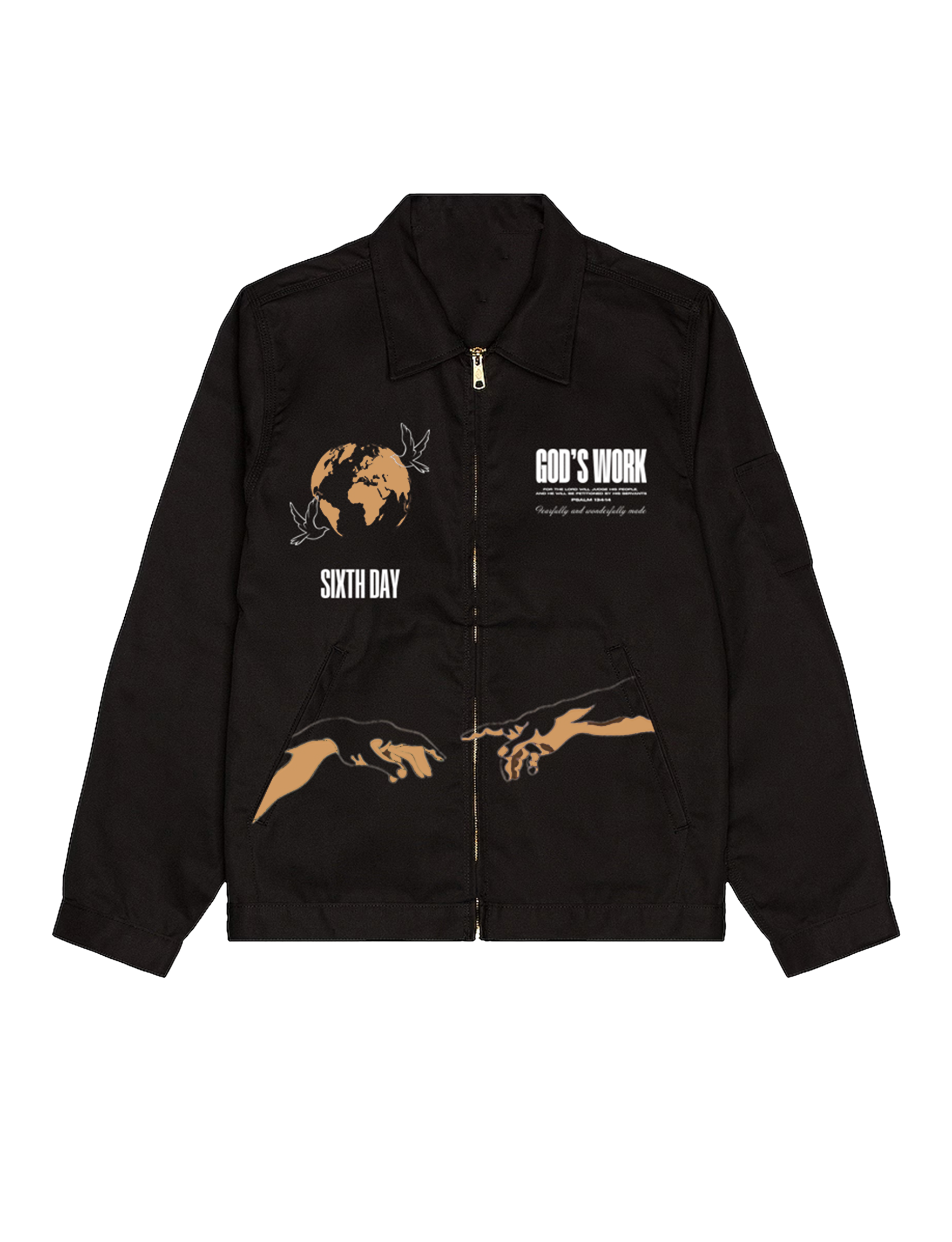 This premium twill fabric jacket, inspired by Psalm 139:14, will guarantee comfort and quality. The eye-catching design is crafted to spark a conversation and showcase your faith wherever you go. Its stern material was designed for workwear, but its stylish design could be worn anywhere.