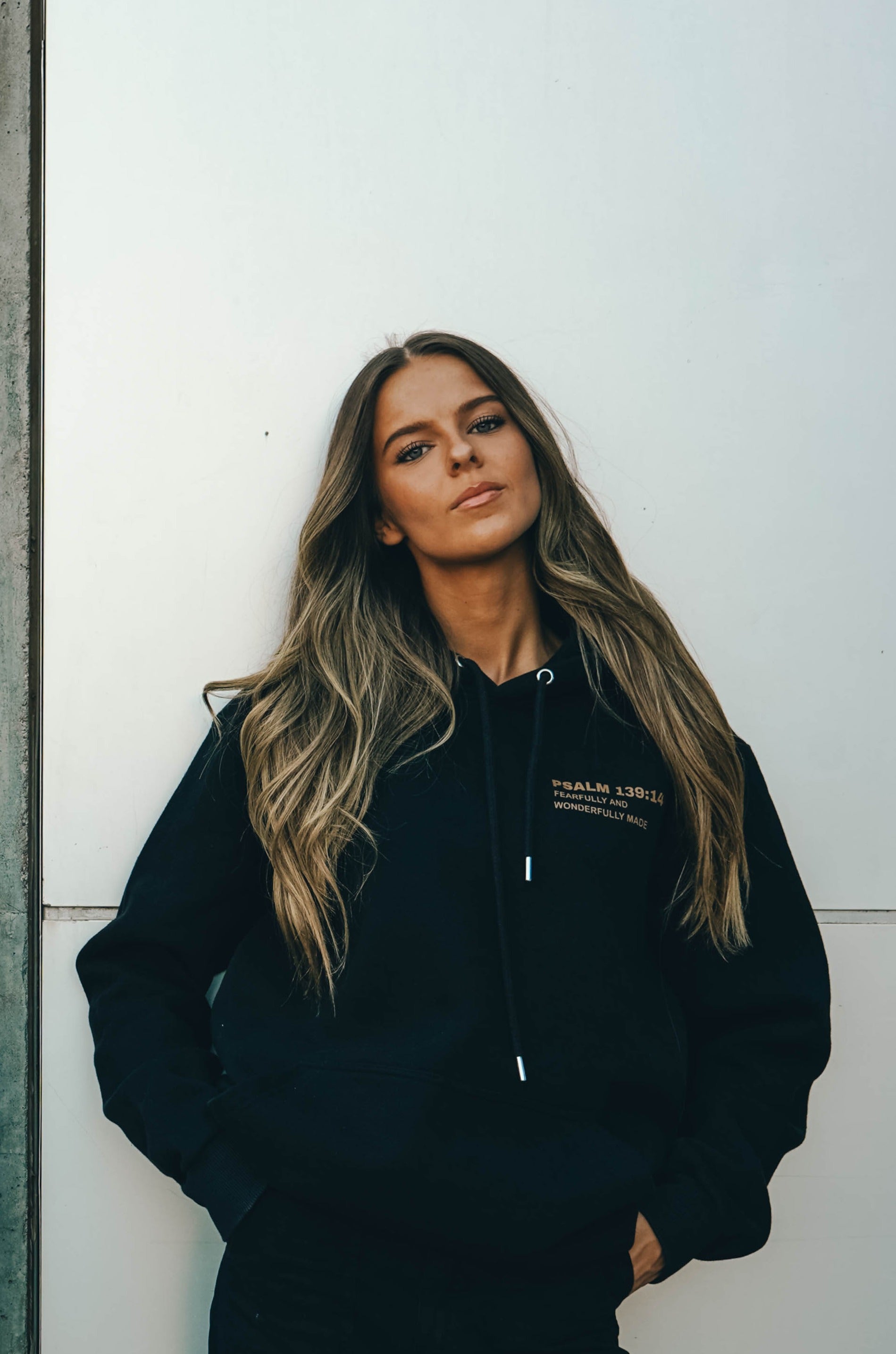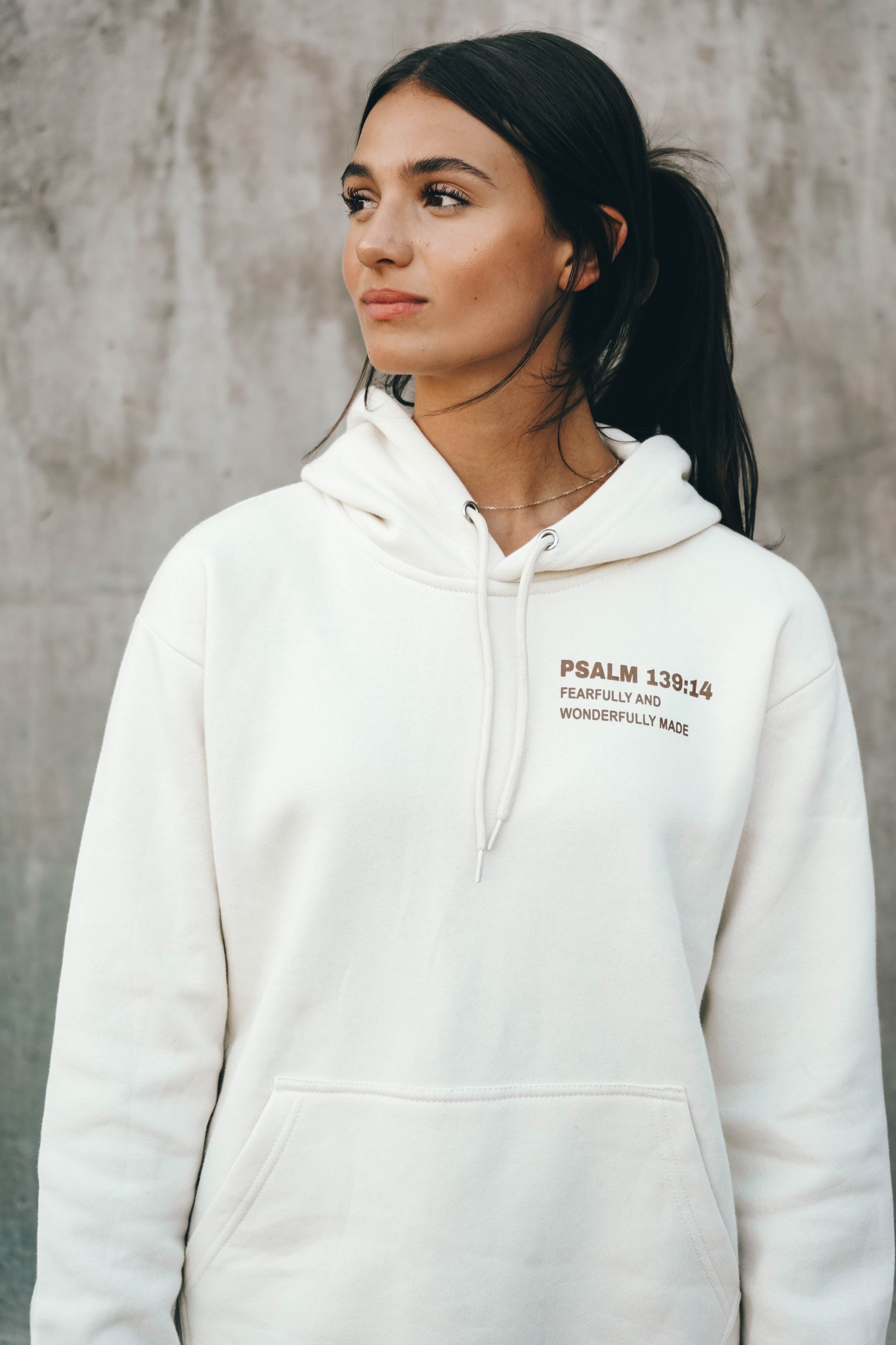 Featuring an eye-catching design, the front of the hoodie showcases the empowering verse from Psalm 139:14, "I praise you because I am fearfully and wonderfully made." The carefully chosen typography and elegant placement make a bold statement, reminding you and those around you of your unique identity in God's eyes.